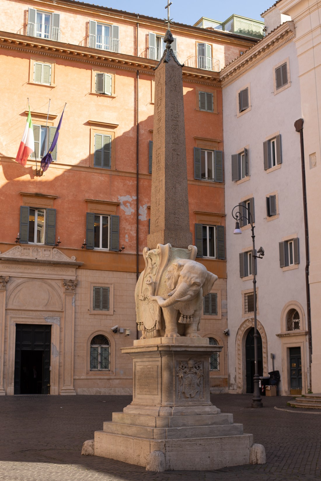Right behind the Pantheon, there is our favorite little square in Rome: Piazza della Minerva. This petite plaza shows us the most artistic elephant in the world. Obelisco Della Minerva (Elephant and Obelisk) designed by Gian Lorenzo Bernini.