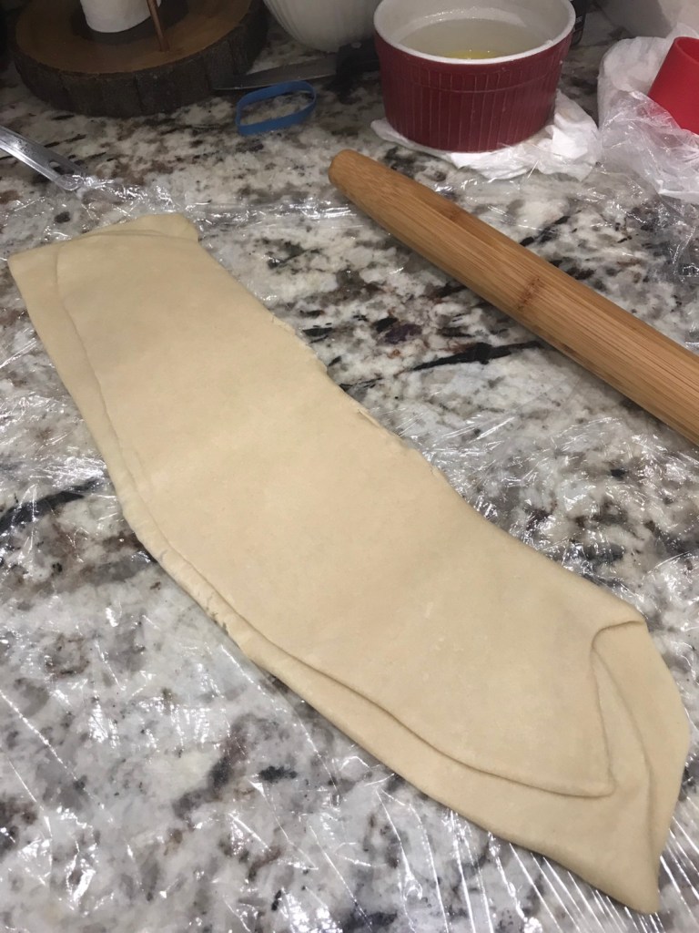 - Using your rolling pan, roll the whole crust into a flat rectangle sheet, then fold it up from the short side to the middle, make it into a smaller rectangle, then fold it up to be a thin rectangle. Again use your rolling pan, roll it into a very flat sheet. Repeat this step 3-4 times. The thinner you roll, the more obviously of layer it comes. cover them fully with plastic wrap for 30 mins after each roll, if the weather you are in is hot and dry, the butter may melt and make a mess. please make sure to cover it well, to prevent the crust from getting dry out.